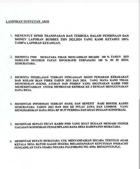 Sementara itu, Kadis PMD Muratara, Defri, memastikan bahwa seluruh tuntutan akan ditindaklanjuti. Ia menyebut sebagian sudah tercatat dalam daftar program kerja Pemda, meski pelaksanaannya membutuhkan proses.