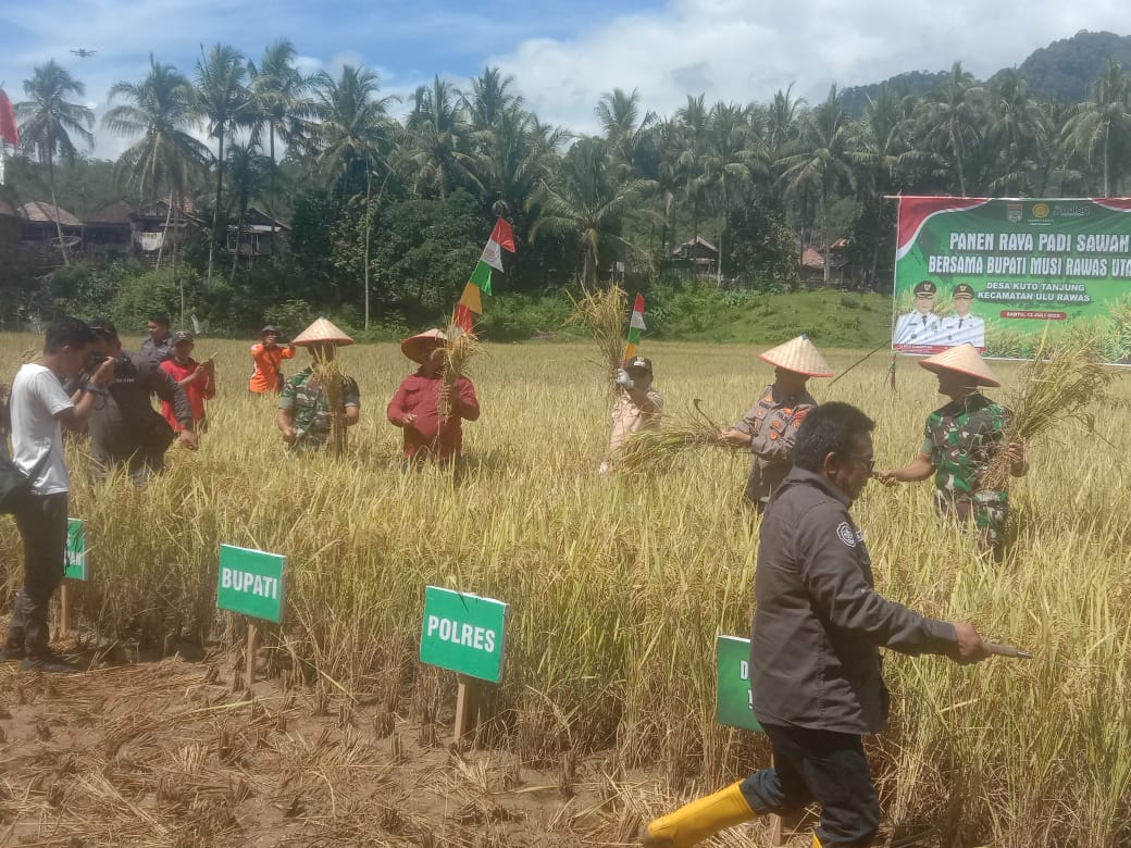 Musi Rawas Utara, Sumatra Selatan – Bupati Musi Rawas Utara, H. Devi Suhartoni, menghadiri panen raya padi sawah di Desa Kuto Tanjung, Kecamatan Ulu Rawas, Kabupaten Musi Rawas Utara, pada 12 Juli 2025. Kegiatan ini juga dihadiri oleh kepala dinas Pertanian, camat Ulu Rawas, kepala desa se-kecamatan Ulu Rawas, Kapolsek Rawas Ulu, dan anggota TNI.