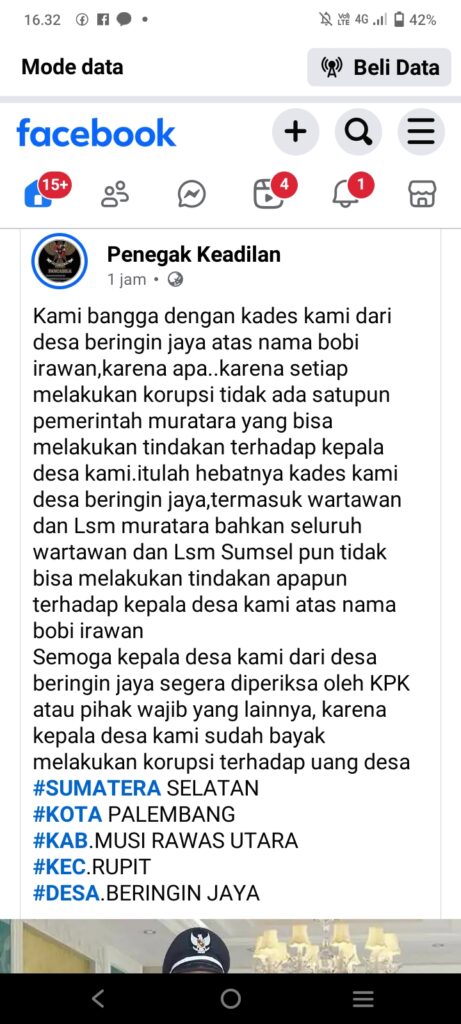 Tuduhan tersebut diposting oleh akun Facebook atas nama “Penegak Keadilan” yang menyatakan bahwa Kepala Desa melakukan korupsi dana desa.