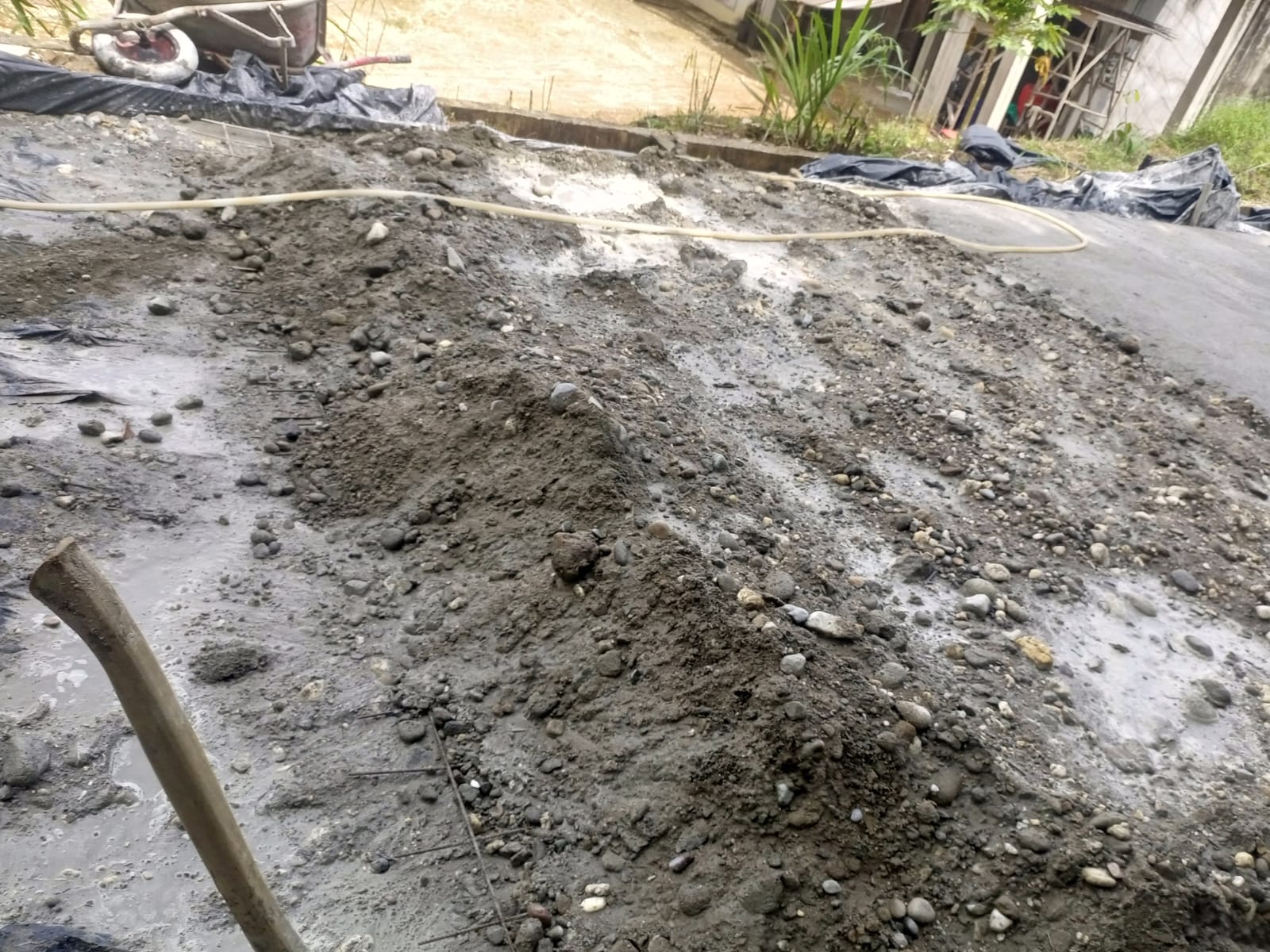 pekerjaan Peningkatan PSU Permukiman Rt.016 Dusun Bangun Rejo Desa Bukit Bumi Raya kecamatan Singkut Kabupaten Sarolangun provinsi Jambi oleh warga, saat Awak media tinjau lapangan terlihat pekerjaan yang di duga campuran tidak sesuai spesifikasi, badan jalan ditimbun dengan tanah lalu di cor sekitar 10 cm dan memakai Pasir merah bercampur tanah, Kamis 5 Juni 2025.