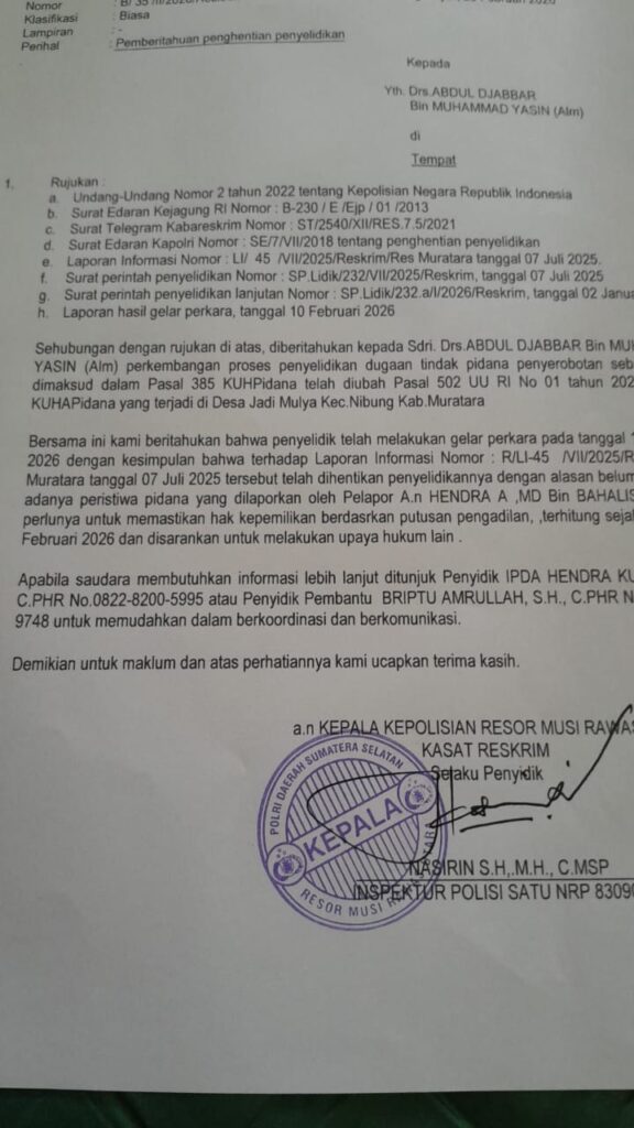 “Surat SP3 tersebut ditandatangani langsung oleh Kasat Reskrim Muratara, Nasirin, dan dikirimkan ke rumah klien saya melalui penyidik,” kata Hendra Bahalis.